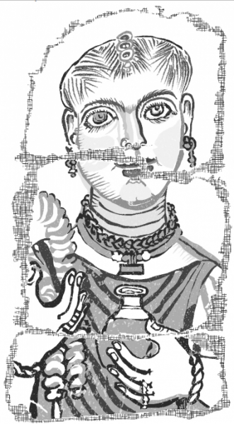 iii. En su mano izquierda pequeño frasco, probablemente ungüentario o botella de aceites perfumados, o posiblemente vino, ya que el líquido es púrpura (ejemplos de tales frascos en cerámica y vidrio se han encontrado en las recientes excavaciones).